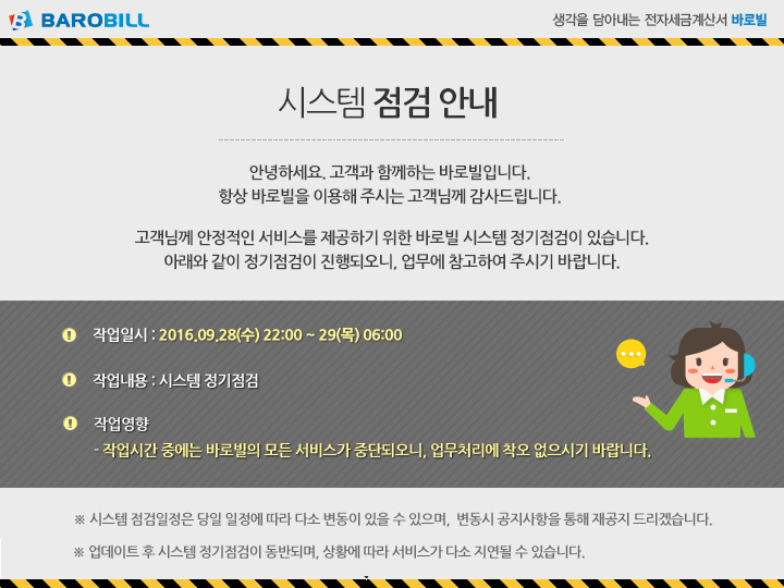 | 제목 | [공지] 바로빌 시스템 정기점검 안내 | 등록일 : 2016-09-26 | 조회수 : 1,210 |