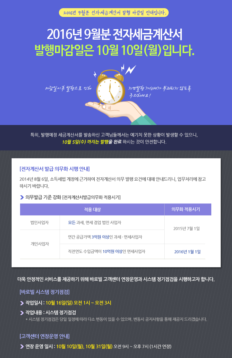 | 제목 | [공지] 2016년 9월분 전자(세금)계산서 발행 마감일 안내입니다. | 등록일 : 2016-09-28 | 조회수 : 1,117 |