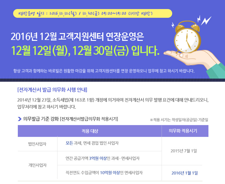 | 이전글 | 공지 [공지] 2016년 11월분 전자(세금)계산서 발행 마감일 안내입니다. | 2016-12-01 | |