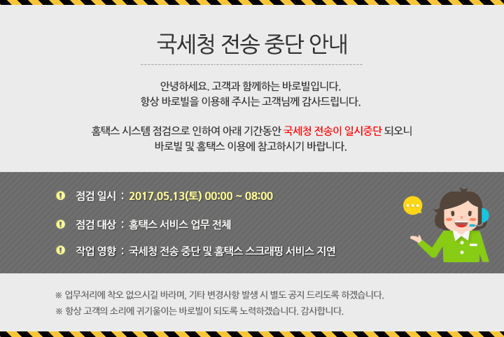 | 제목 | [공지] 홈택스 시스템점검으로 인한 국세청 전송중단 안내 | 등록일 : 2017-05-12 | 조회수 : 1,534 |