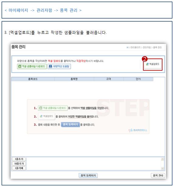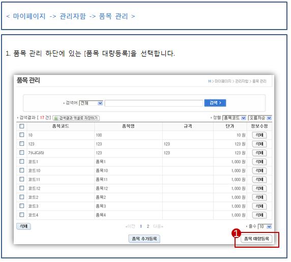 | 위치 | 전자세금계산서 -> 대량서비스 -> 품목 등록 | ||
