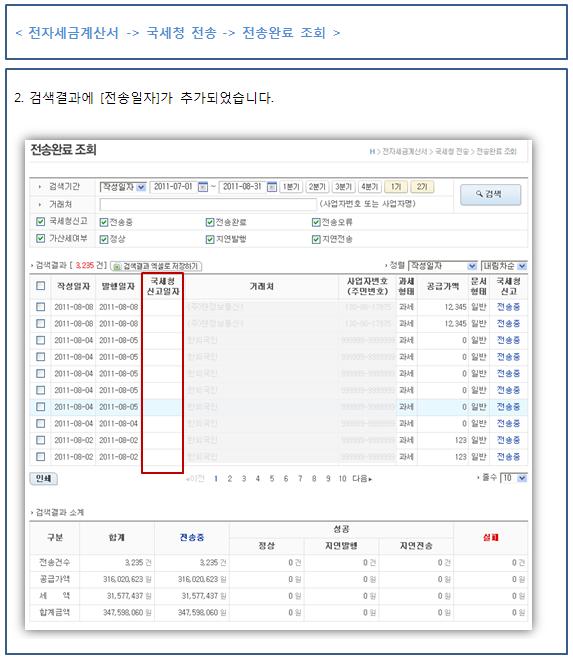 2. 전송완료 조회 -> 검색결과에 국세청 전송일자 항목 추가