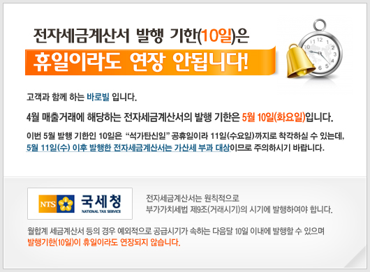 | 제목 | [공지] 4월 매출 발행 기한 안내 | 등록일 : 2011-05-06 | 조회수 : 2,068 |