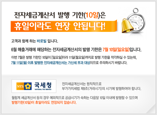 | 제목 | [공지] 6월 매출 발행 기한 안내 | 등록일 : 2011-07-01 | 조회수 : 1,867 |