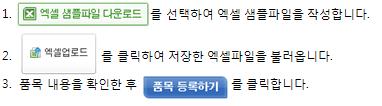6. 품목 대량등록 절차 [ 마이페이지 -> 관리자함 -> 품목 관리 -> 품목 대량등록 ] |
