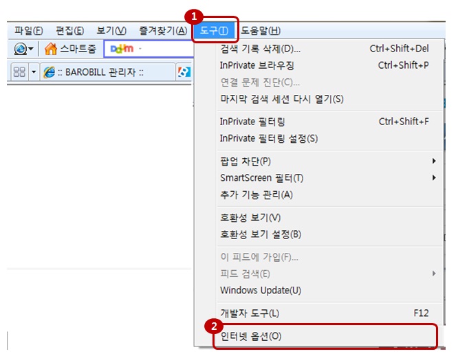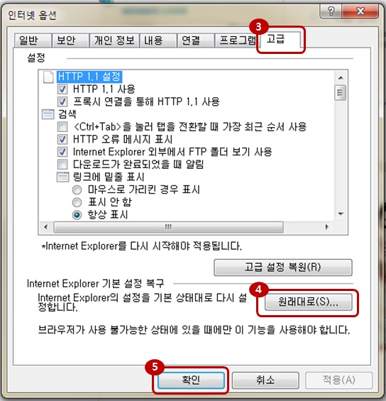 2. [ 도구 > 인터넷 옵션 > 고급 > Internet Explorer 기본 설정 복구 ] 에서 [원래대로] 버튼을 클릭하여, Internet Explorer의 설정을 기본 상태로 다시 설정합니다.