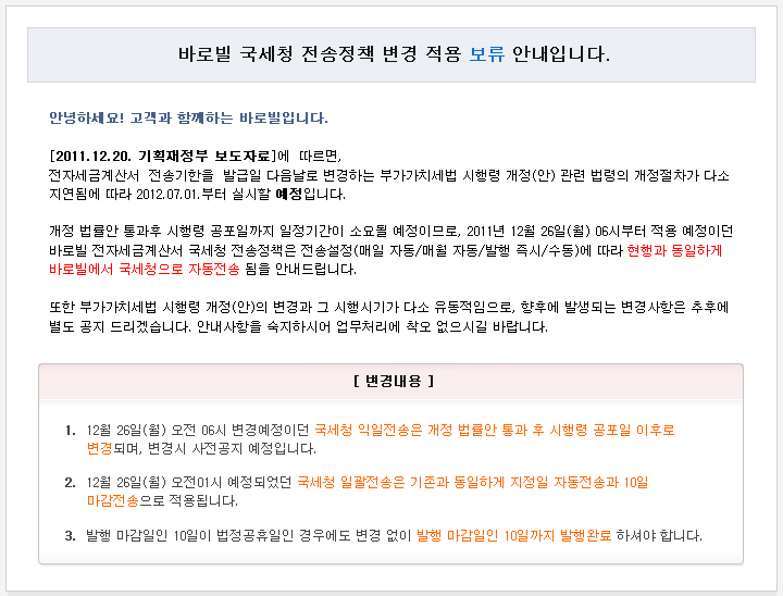 | 제목 | [필독] 바로빌 국세청 전송정책 변경 적용 보류 안내입니다. | 등록일 : 2011-12-22 | 조회수 : 3,414 |