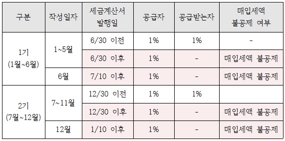 이와 관련하여 부가세 신고분기에 따른 전자세금계산서의 발행기한에 따른 가산세 및 매입세액 불공제에 관련된 내용을 다음과 같이 다시한번 안내하오니 참고하시어 업무처리에 참고하시기 바랍니다.