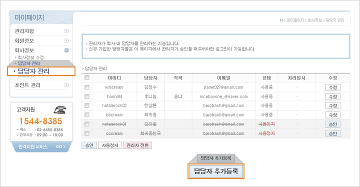 선택한 다음 등록할 담당자 정보를 입력하실 수 있습니다. |