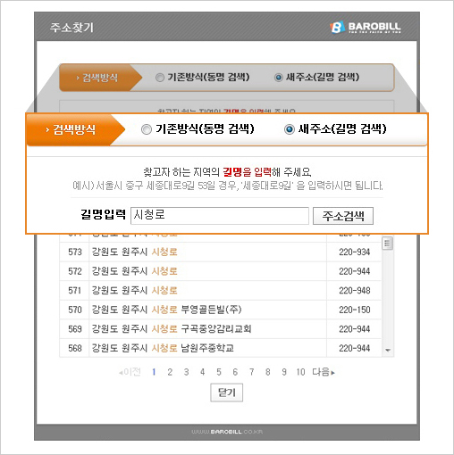 주소 검색방식에 기존의 동명 검색방식에 신주소 체계인 길명 검색방식이 추가되었습니다. |