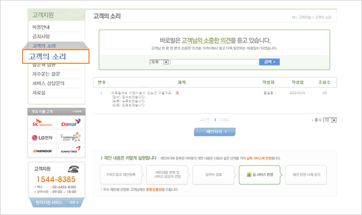 | 제목 | 고객의 소리 기능 추가 | 등록일 : 2012-02-06 | 조회수 : 1,752 |