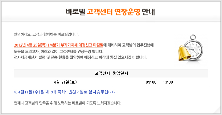 | 제목 | [공지] 바로빌 고객센터 연장운영 안내 | 등록일 : 2012-04-10 | 조회수 : 1,987 |