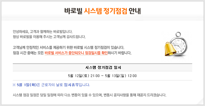 | 제목 | [공지] 바로빌 시스템 정기점검 안내 | 등록일 : 2012-04-26 | 조회수 : 1,695 |