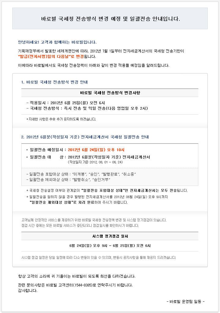 | 제목 | [공지] 바로빌 국세청 전송방식 변경 예정 및 일괄전송 안내입니다. | 등록일 : 2012-05-29 | 조회수 : 2,266 |