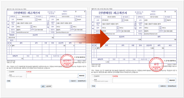 2. [발행예정]세금계산서는 “발행(전자서명)”이 완료되기 전의 확인용 문서입니다. 공급자가 “발행(전자서명)”을 완료하기 전까지는 전자세금계산서로서의 효력이 없음에도, 전자세금계산서로 생각하시는 분들이 많아 인쇄를 하실수없도록 시스템을 변경하였습니다. [발행예정]세금계산서는 내용 확인만 하신다음, 공급자가 “발행(전자서명)” 완료한 전자세금계산서를 출력해서 보관하시기 바랍니다. |