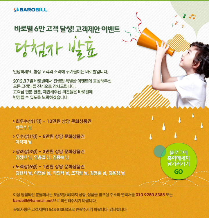 | 제목 | [이벤트] 바로빌 6만고객 달성! 고객제안 이벤트 당첨자 발표 | 등록일 : 2012-08-02 | 조회수 : 2,159 |