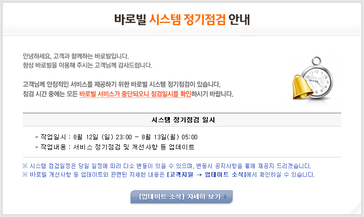 | 제목 | [공지] 8월 바로빌 시스템 정기점검 안내 | 등록일 : 2012-08-08 | 조회수 : 1,681 |