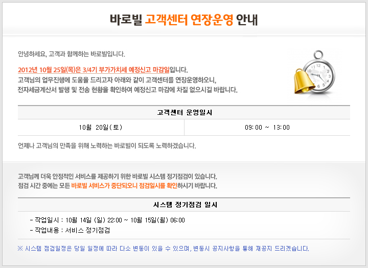| 제목 | [공지] 2012년 10월 바로빌 고객센터 연장운영 안내 | 등록일 : 2012-10-09 | 조회수 : 1,625 |